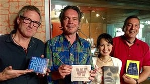 life. Here he is, in the red shirt, so jovial, genuinely warm and cheery in real life. Beside us are two very talented musicians David Bridie and Charles Jenkins.